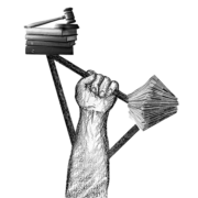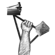 El plato que esta inclinado hacia el lado derecho sostiene materiales de archivo y en el lado izquierdo unos códigos jurídicos, que representan la parcialidad de las leyes colombianas.